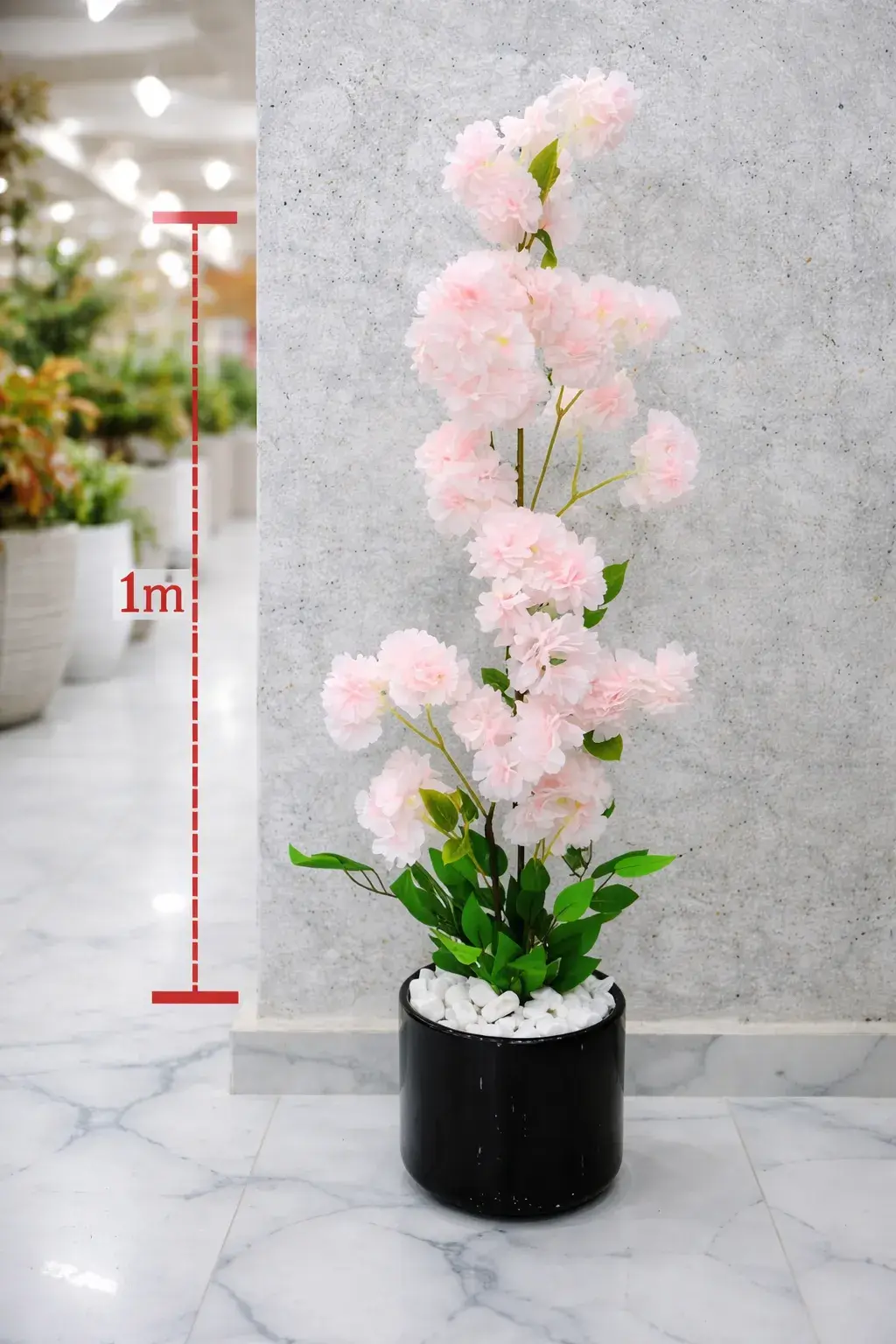 Installée dans un pot noir moderne avec pierres décoratives, cette plante offre un contraste chic qui s’intègre facilement aux décorations contemporaines, minimalistes ou romantiques. Avec sa hauteur de 1 m, elle devient un bel élément décoratif vertical sans nécessiter aucun entretien.