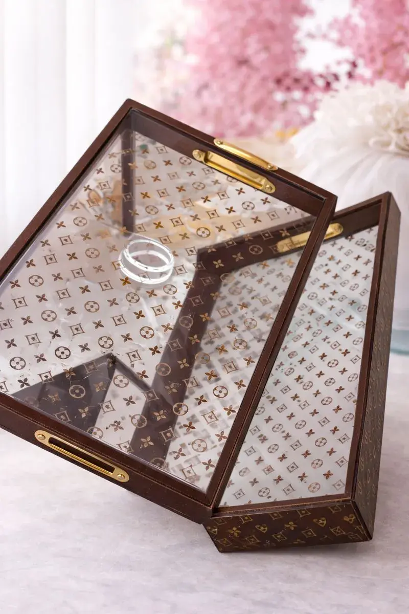 Ce plateau décoratif rectangulaire allie élégance et praticité pour sublimer votre intérieur. Son design raffiné associe une structure effet bois foncé, une surface en verre transparent et de délicates poignées dorées, offrant une touche chic et moderne.