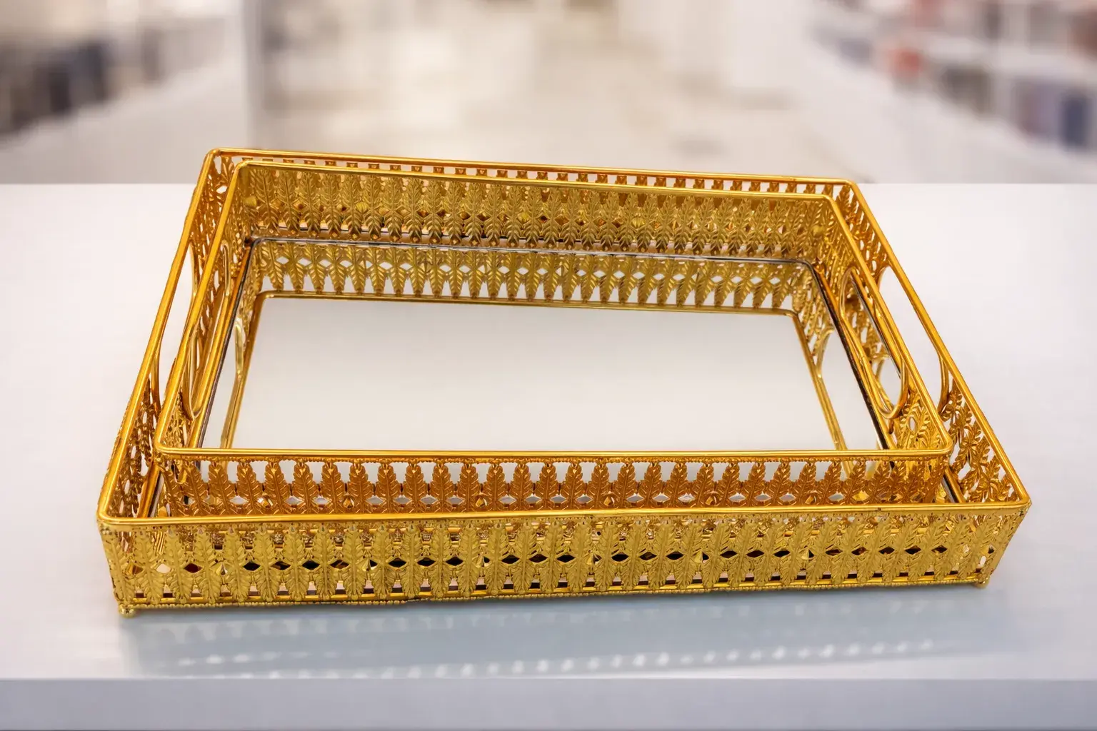 Ajoutez une touche élégante et raffinée à votre intérieur avec ce plateau décoratif rectangulaire au fini doré brillant. Son design ajouré travaillé et ses lignes nettes en font un accessoire décoratif chic, idéal pour sublimer une table, un buffet ou une coiffeuse.