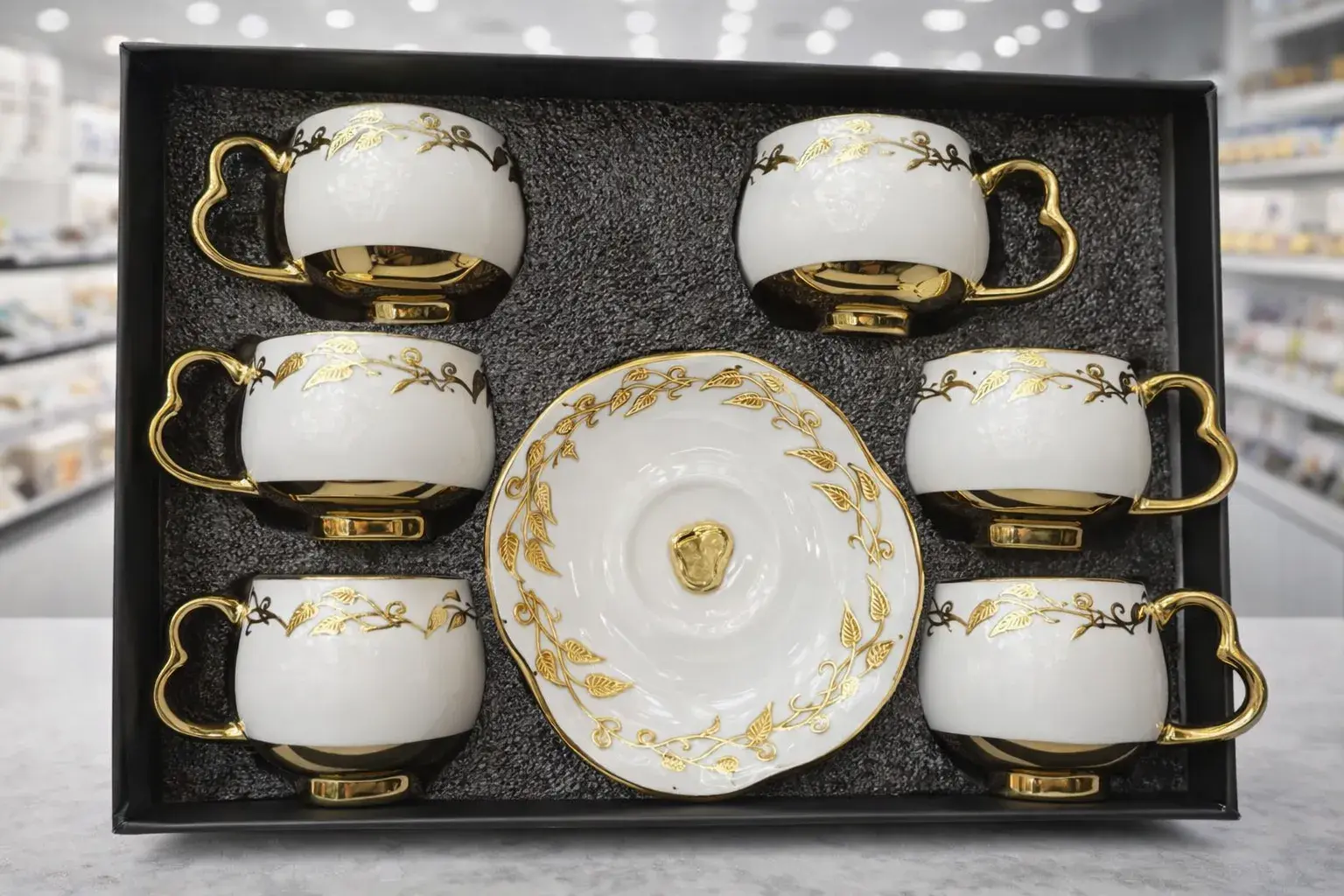 Les tasses sont dotées d’anses dorées élégantes et reposent sur des soucoupes finement décorées, idéales pour servir le café avec style lors de vos réceptions ou moments spéciaux. Ce service apporte une touche chic et prestigieuse à votre table et constitue également une excellente idée cadeau.