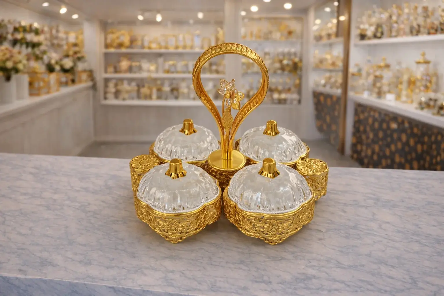 Parfait pour présenter des fruits secs, chocolats, bonbons, dattes ou douceurs, ce service est idéal pour les réceptions, fêtes, mariages et le mois de Ramadan. Son design élégant et travaillé allie la transparence du verre à l’éclat du métal doré pour un rendu chic et intemporel.