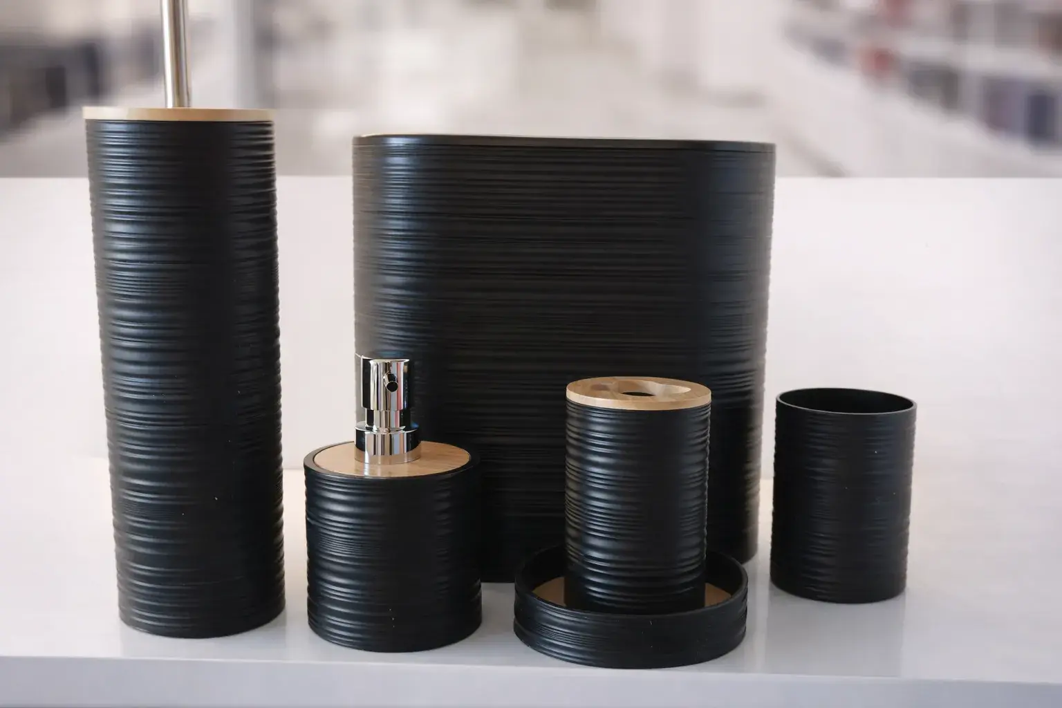 Set d’accessoires de salle de bain noir mat texturé avec détails effet bois
