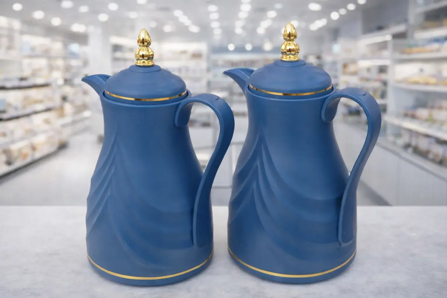 Ce thermos isotherme bleu allie élégance et performance pour conserver vos boissons chaudes ou froides plus longtemps. Son design moderne aux lignes ondulées, sublimé par des détails dorés raffinés, apporte une touche luxueuse à votre table ou à votre cuisine.